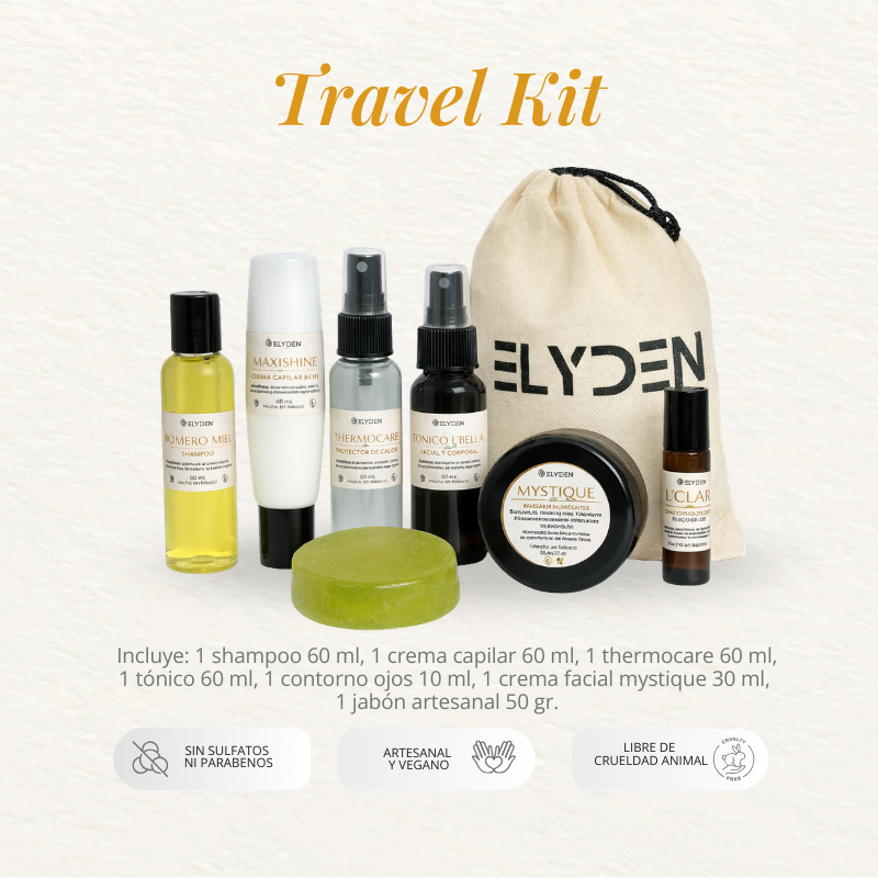 Incluye: 1 Shampoo 60 ml, 1 crema capilar 60 ml, 1 protector de calor 60 ml, 1 contorno de ojos 10 ml, 1 tónico 60 ml, 1 crema mystique 30 ml, 1 jabon artesanal 50 gr.